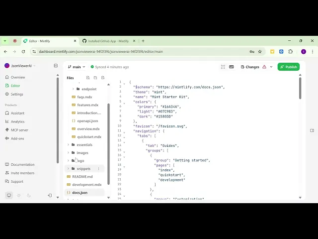 Mintlify assumes comfort with Markdown and MDX. While a basic visual editor exists, meaningful control over structure and navigation requires editing files and configuration such as docs.json. In practice, reorganizing sections or navigation involves manual config updates. Collaboration features are developer‑centric, with no Google‑Docs‑style comments or suggestion workflows.