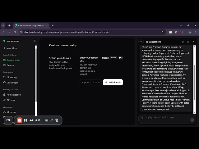 Mintlify’s AI works primarily as a writing and suggestion assistant. During testing, it responded slowly and was limited to small rewrites or contextual suggestions. It does not generate a complete documentation structure on its own, and users must manually apply changes in the correct MDX or configuration files.
