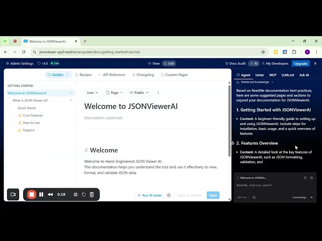 ReadMe’s AI features are page-level and assistive. Tools like Agent Owlbert can rewrite sections, suggest missing content, and improve clarity. Additional tools such as AI Linter and Docs Audit help with consistency and quality checks.
