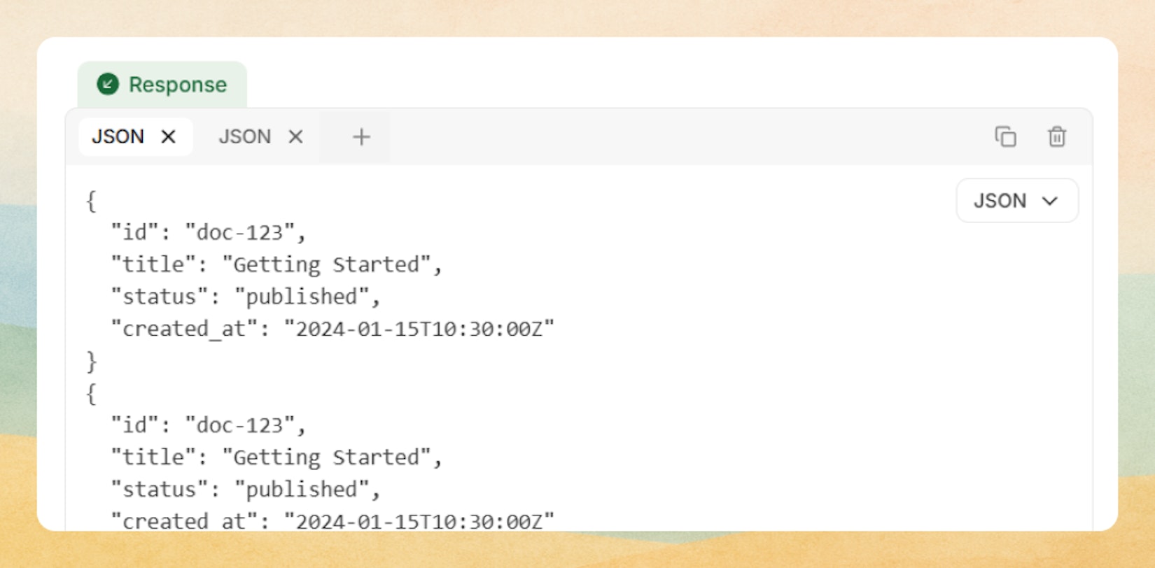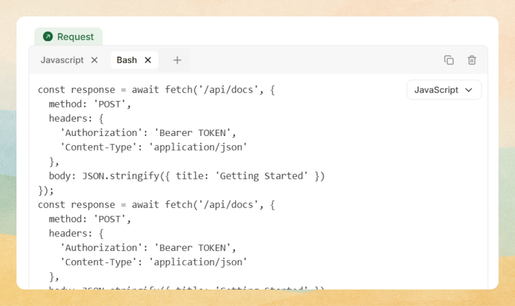 Multi-language SDKs: Use Request tabs for JavaScript, Python, Bash, and other SDKs.