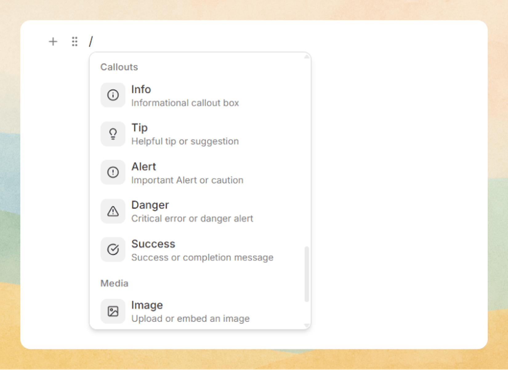 This works similarly to callouts in tools like Notion, but with five distinct styles.