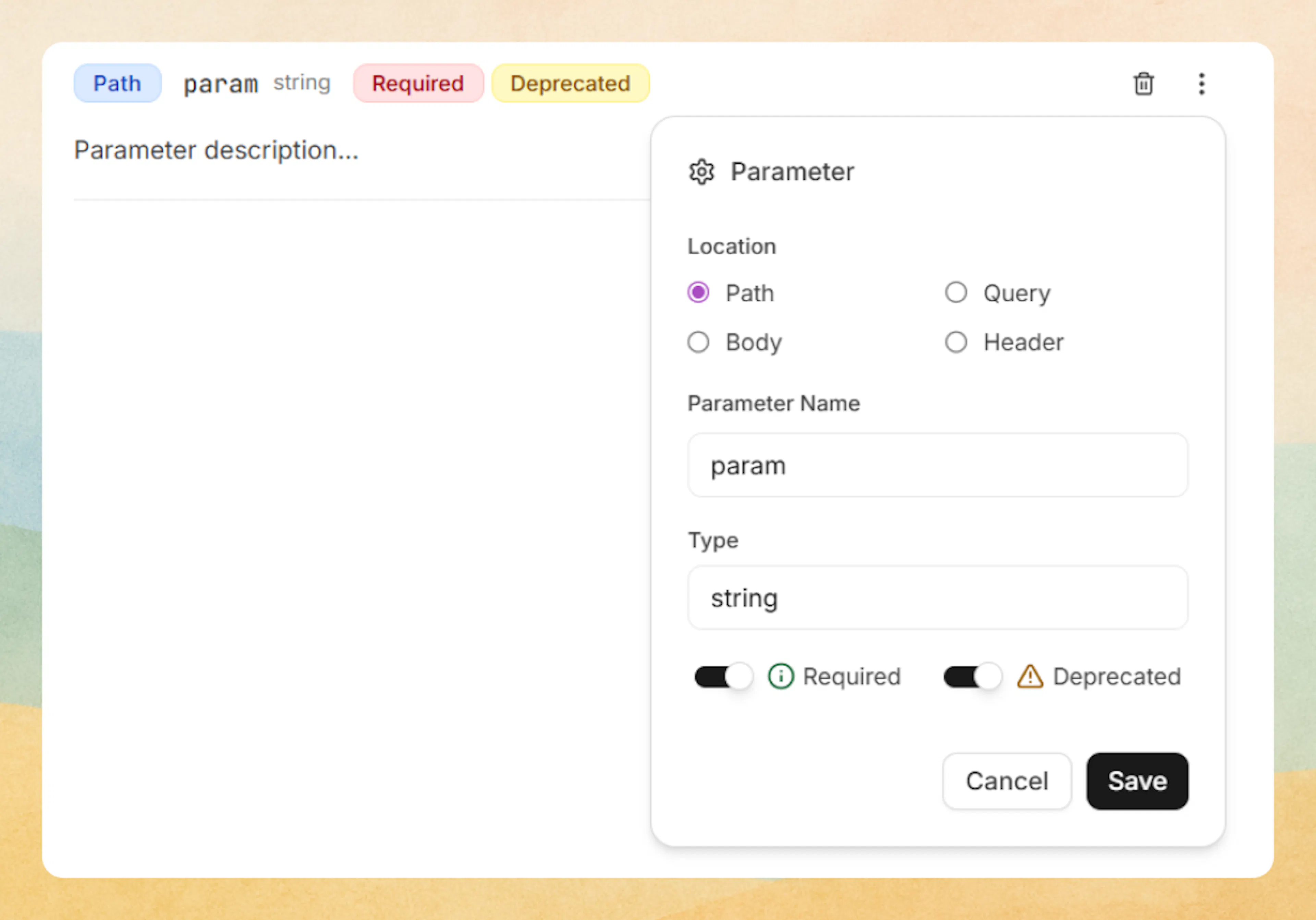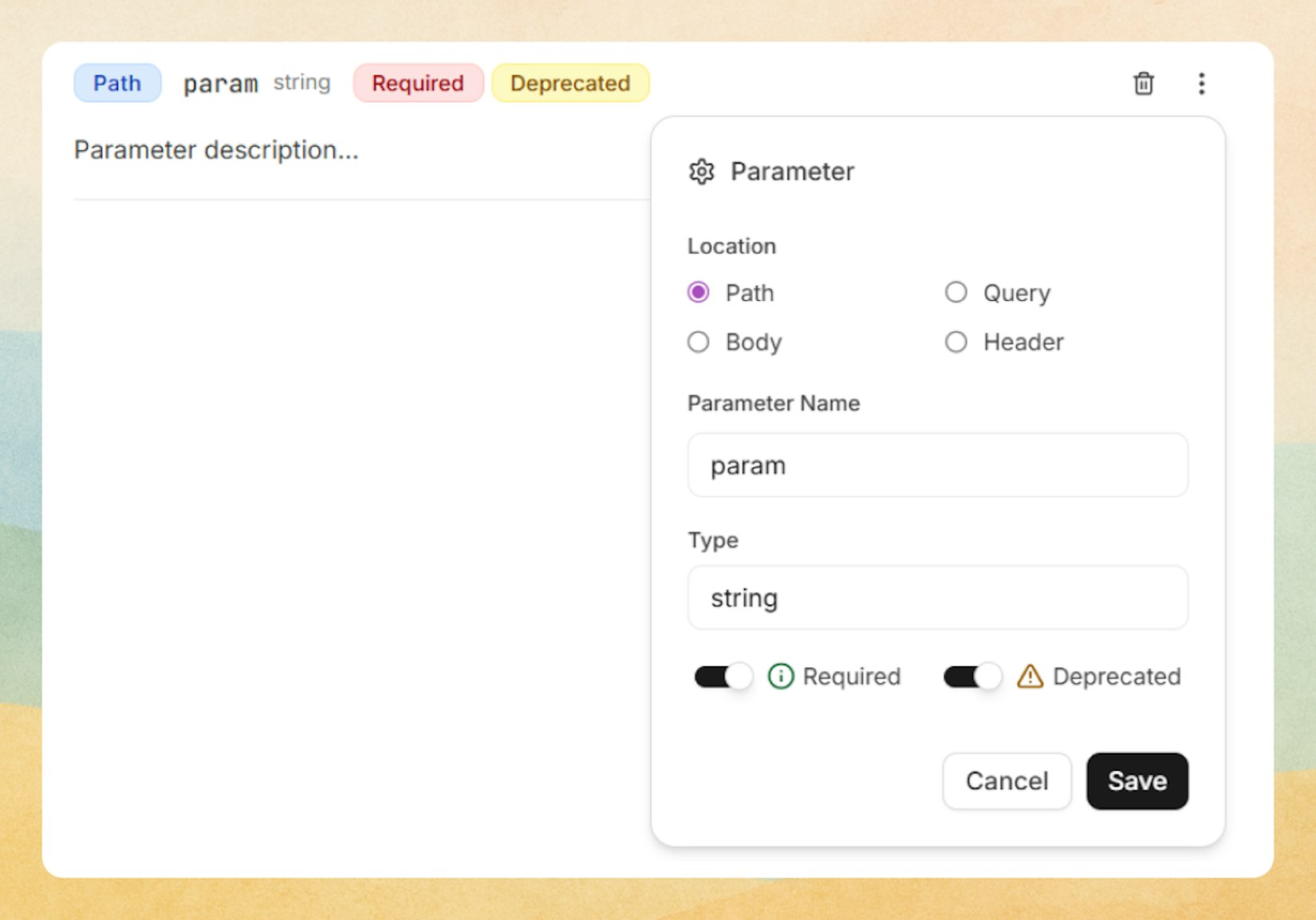 Reference for documenting API parameters with location badges, types, and status indicators.