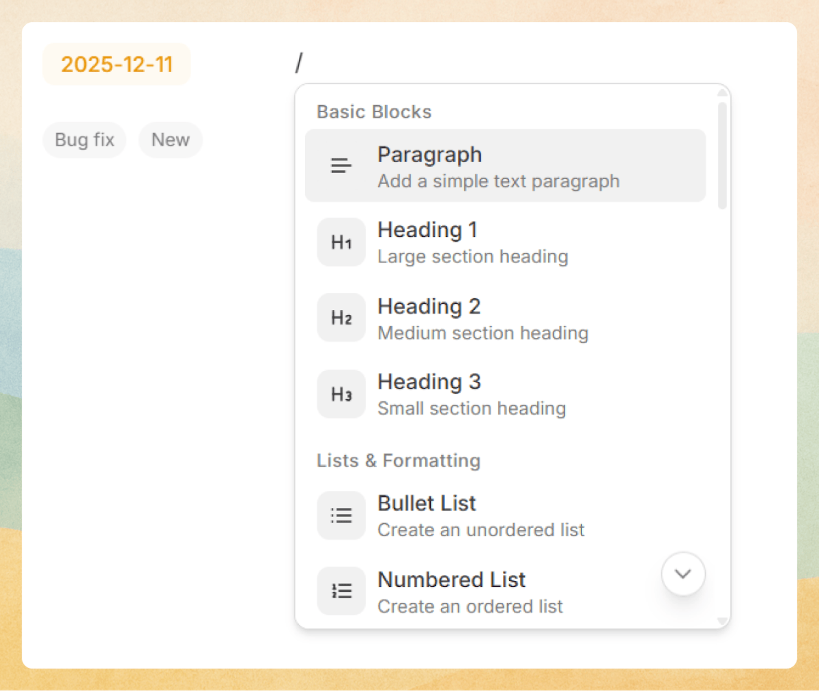 Combine Update blocks with Cards, Callouts, Steps, and Tabs to build rich changelog and announcement pages that are easy to scan and delightful to read.