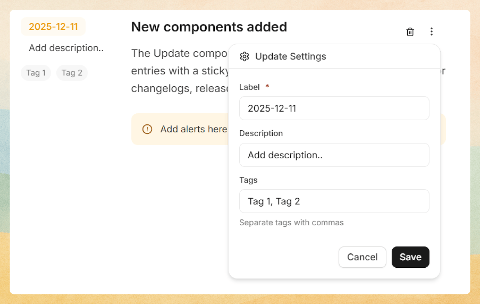 The Update component creates clean, timeline-style blocks with a label on the left (date, version, or tag) and rich content on the right. It’s perfect for:
