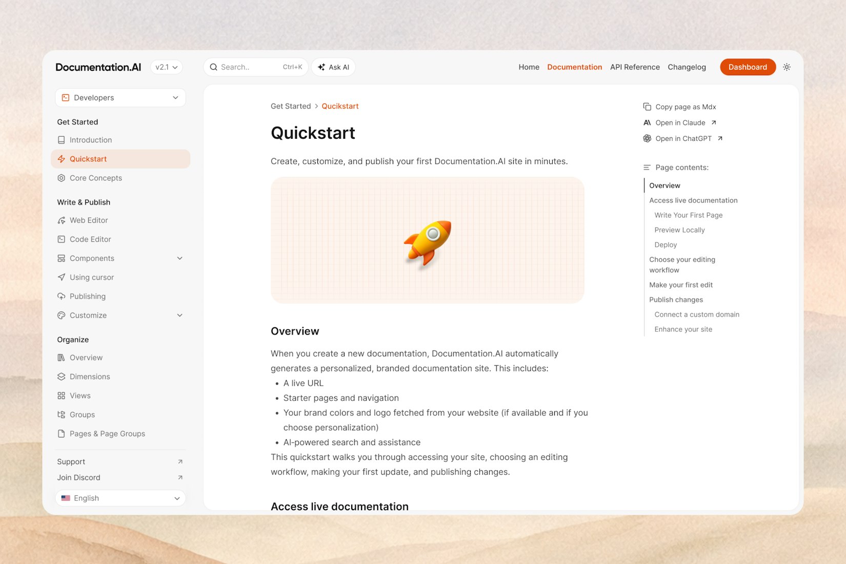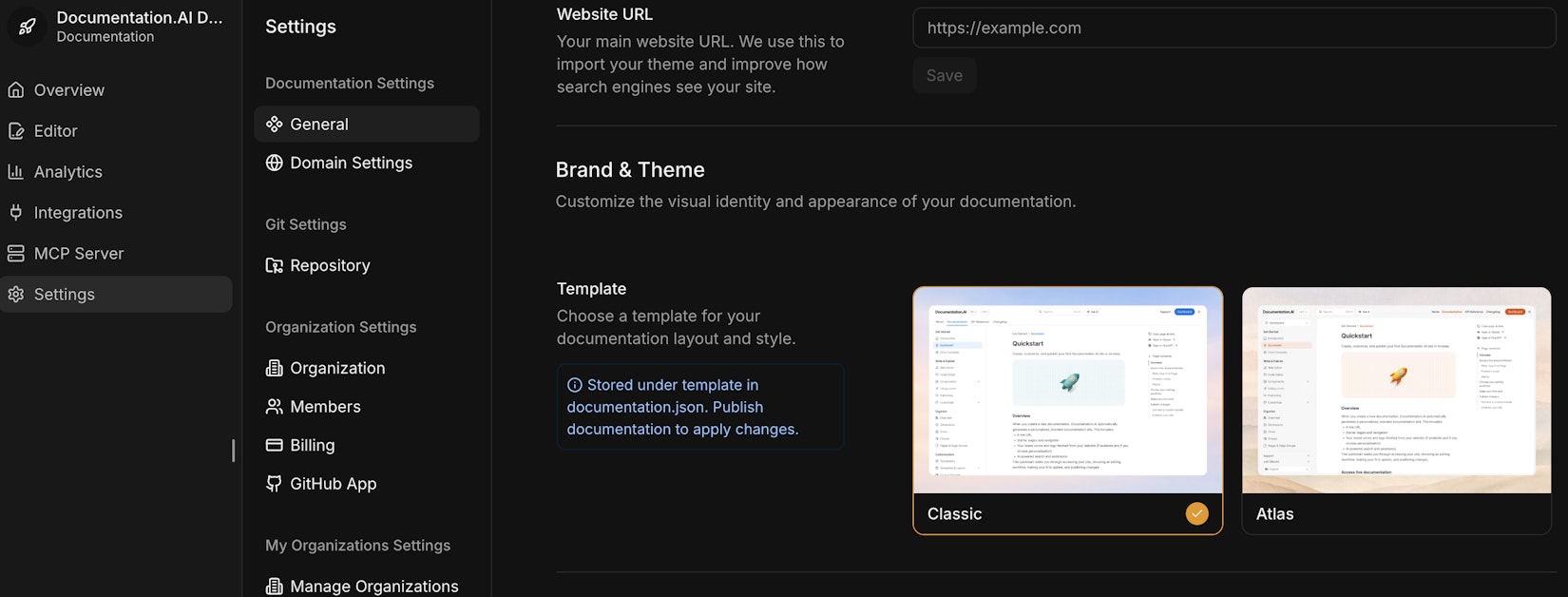 Templates control the layout and style of your documentation site. Choose from pre-built templates or customize your own to match your brand identity.